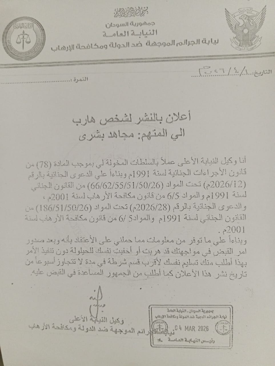 أصدرت نيابة الجرائم الموجّهة ضد الدولة ومكافحة الإرهاب إعلاناً رسمياً طالبت فيه المتهم مجاهد بشري بتسليم نفسه خلال مهلة لا تتجاوز أسبوعاً من تاريخ نشر الإعلان، وذلك استناداً إلى السلطات المخوّلة لوكيل النيابة الأعلى بموجب المادة (78) من قانون الإجراءات الجنائية لسنة 1991.