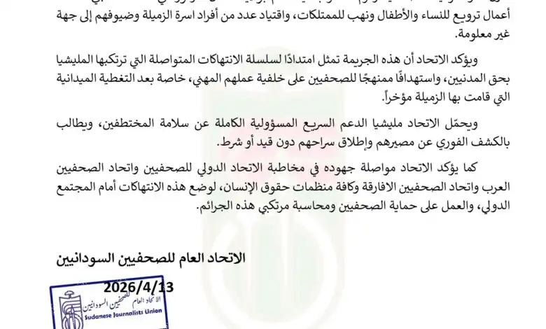 وحمل الاتحاد مليشيا الدعم السريع المسؤولية الكاملة عن سلامة المختطفين، مطالباً بالكشف الفوري وغير المشروط عن مصيرهم، وضمان عودتهم الآمنة.
