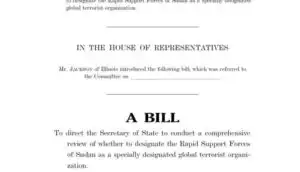 طرح نواب من الحزب الديمقراطي في مجلس النواب الأمريكي، يوم الأربعاء 15 أبريل 2026، مشروع قانون يطالب وزارة الخارجية بإجراء مراجعة شاملة لتصنيف “مليشيا الدعم السريع” كمنظمة إرهابية عالمية مصنفة بشكل خاص (SDGT). ويأتي هذا التحرك التشريعي بالتزامن مع الذكرى السنوية الثالثة لاندلاع الحرب في السودان، بهدف زيادة الضغوط الدولية على المليشيا ومحاسبتها على الانتهاكات الجسيمة المرتكبة ضد المدنيين.