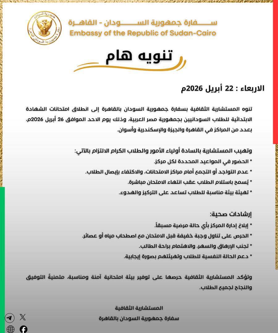 أصدرت المستشارية الثقافية بسفارة جمهورية السودان بالقاهرة تنويهاً هاماً بشأن انطلاق امتحانات الشهادة الابتدائية للطلبة السودانيين بجمهورية مصر العربية، والمقرر أن تبدأ يوم الأحد 26 أبريل 2026، بعدد من المراكز في القاهرة والجيزة والإسكندرية وأسوان.