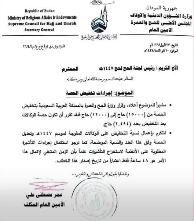 أعلنت السلطات السعودية عن تخفيض حصة السودان في موسم حج 1447هـ إلى 12 ألف حاج، بعد أن كانت مقررة بـ15 ألفاً، ما يعني استبعاد نحو 3 آلاف حاج من القوائم المعتمدة.