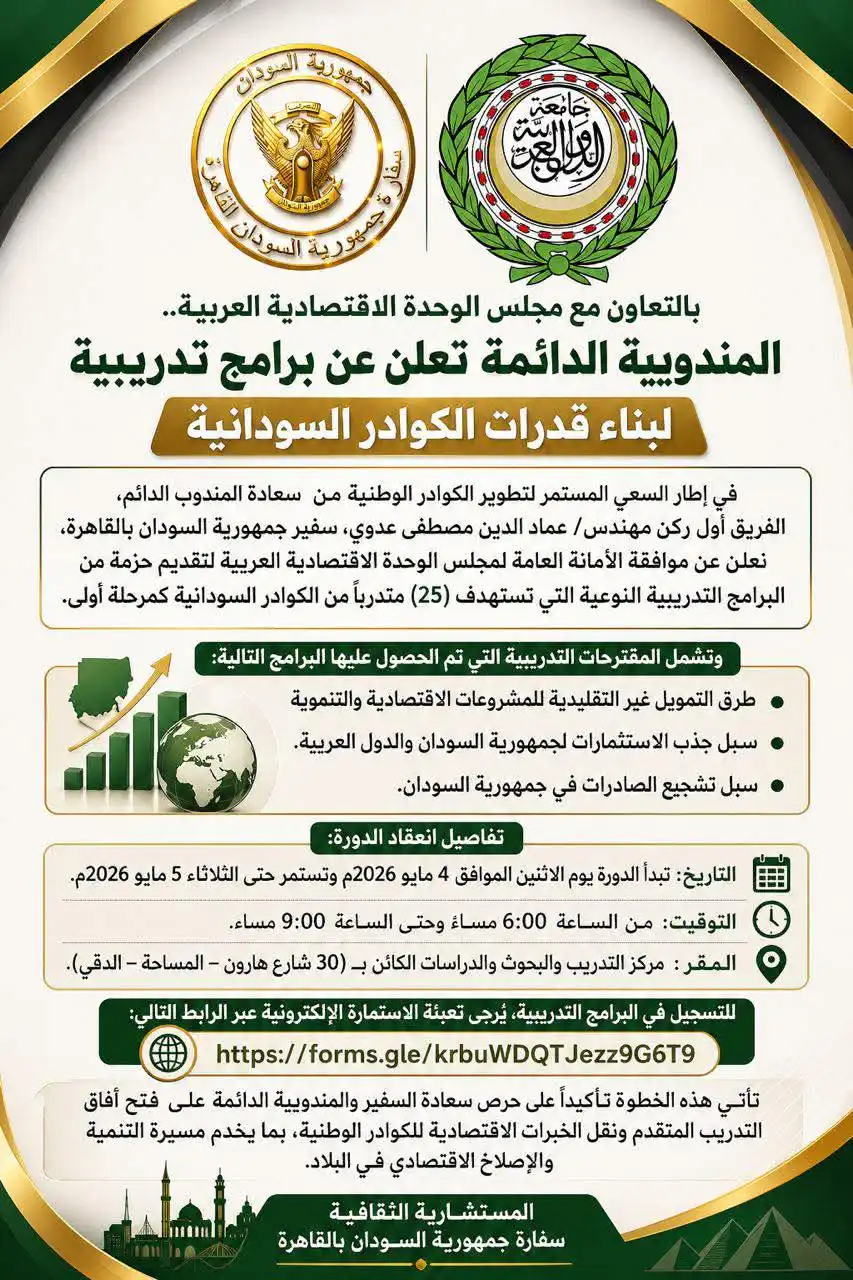 المندوبية الدائمة لجمهورية السودان بالقاهرة تعلن عن برامج تدريبية كبرى للكوادر السودانية